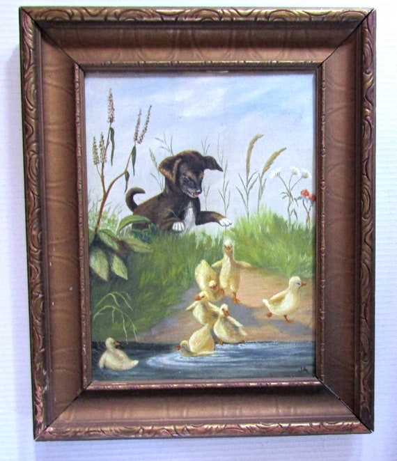 Painting of Puppy Playing with Ducks Oil on Canvas Early Painting Signed JA