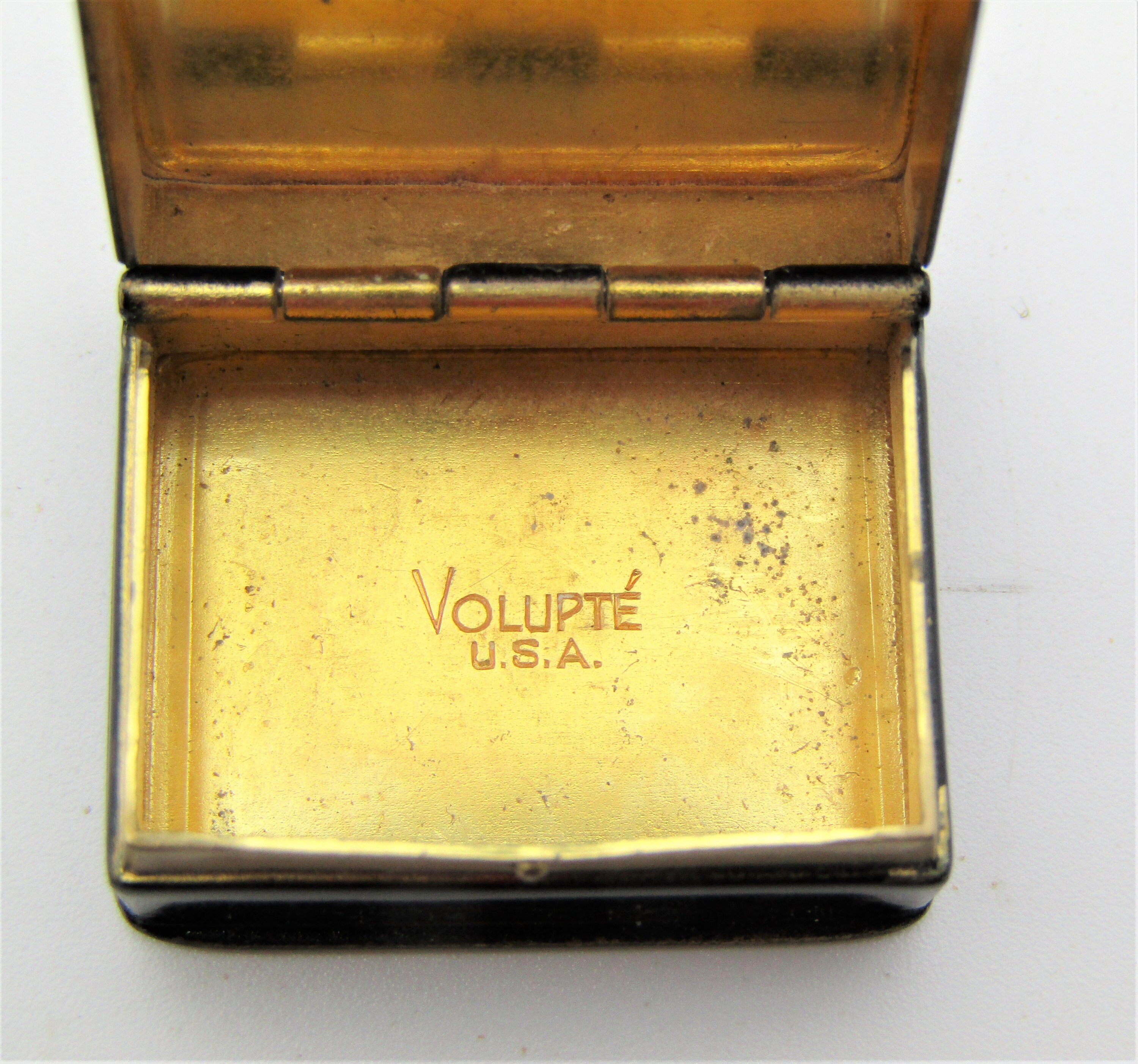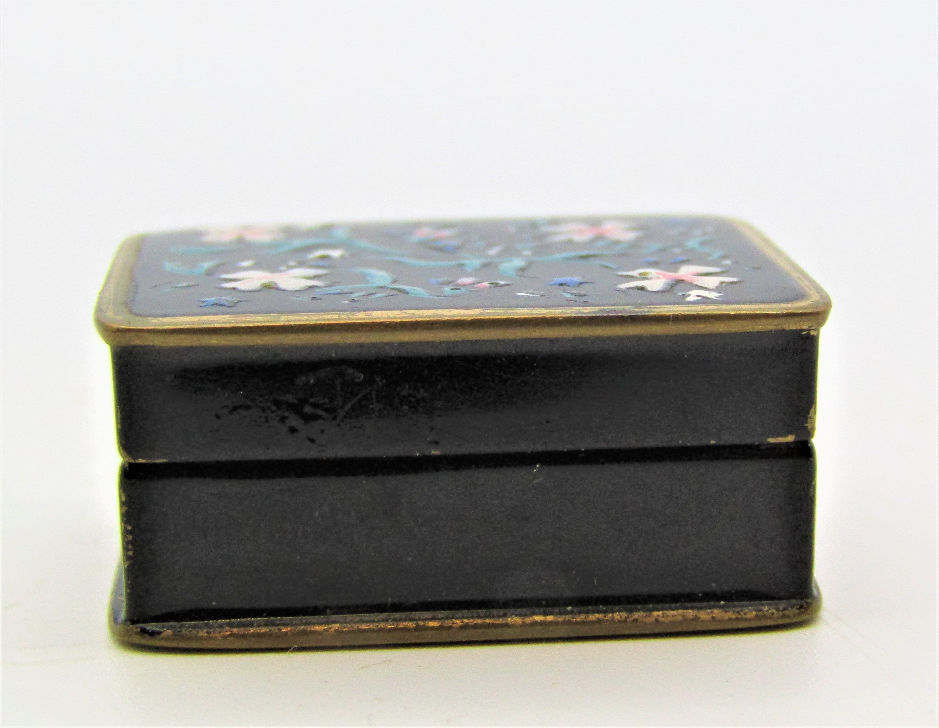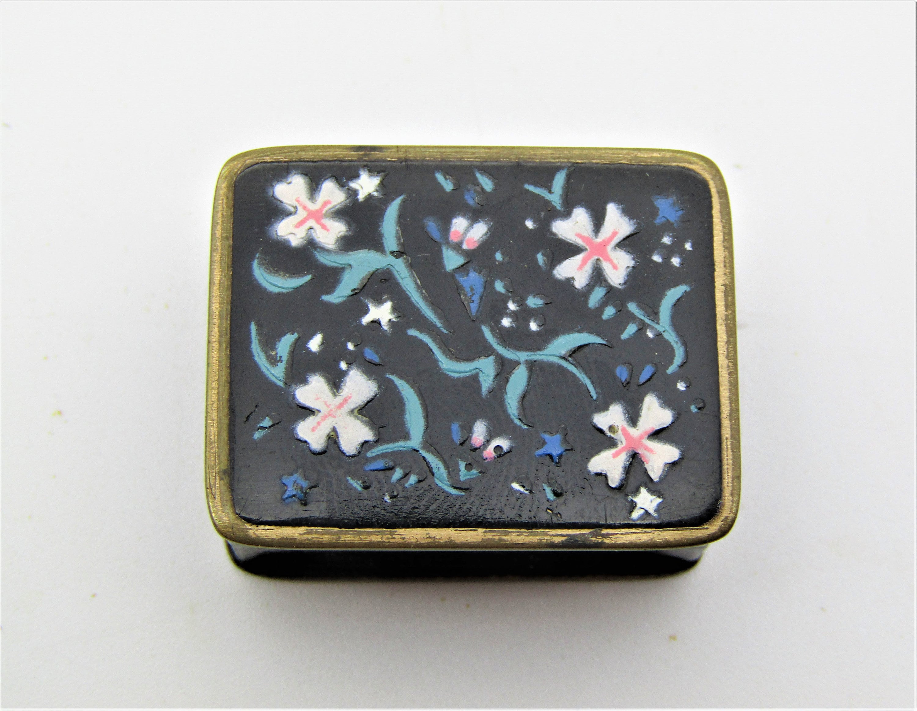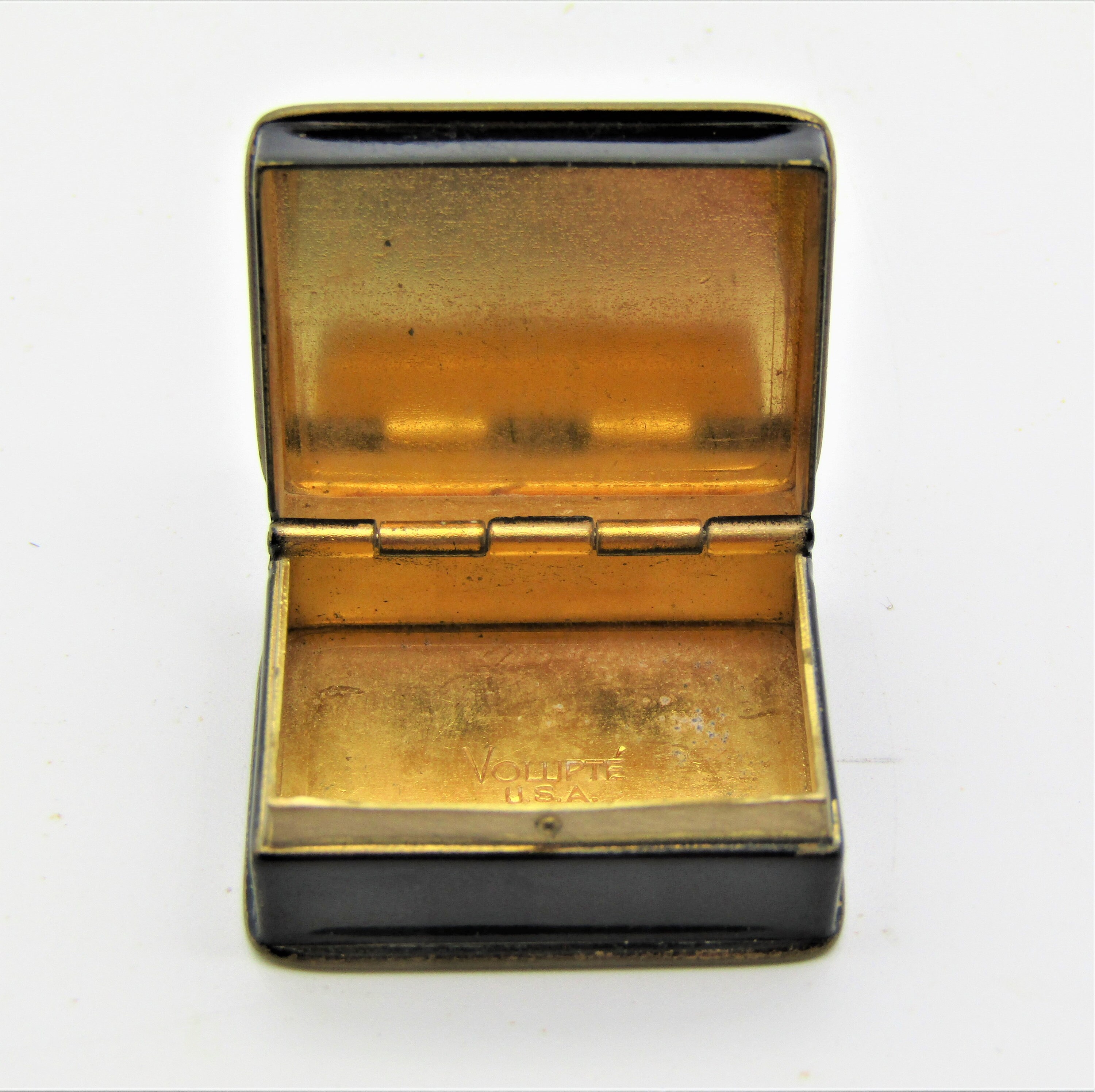 Miniature Volupte pill box or snuff box. Black enamel with enamel flowers. This was made around the 1920's. It has some light wear to the gold interior and the gold gilt on the outside. Please see pictures.