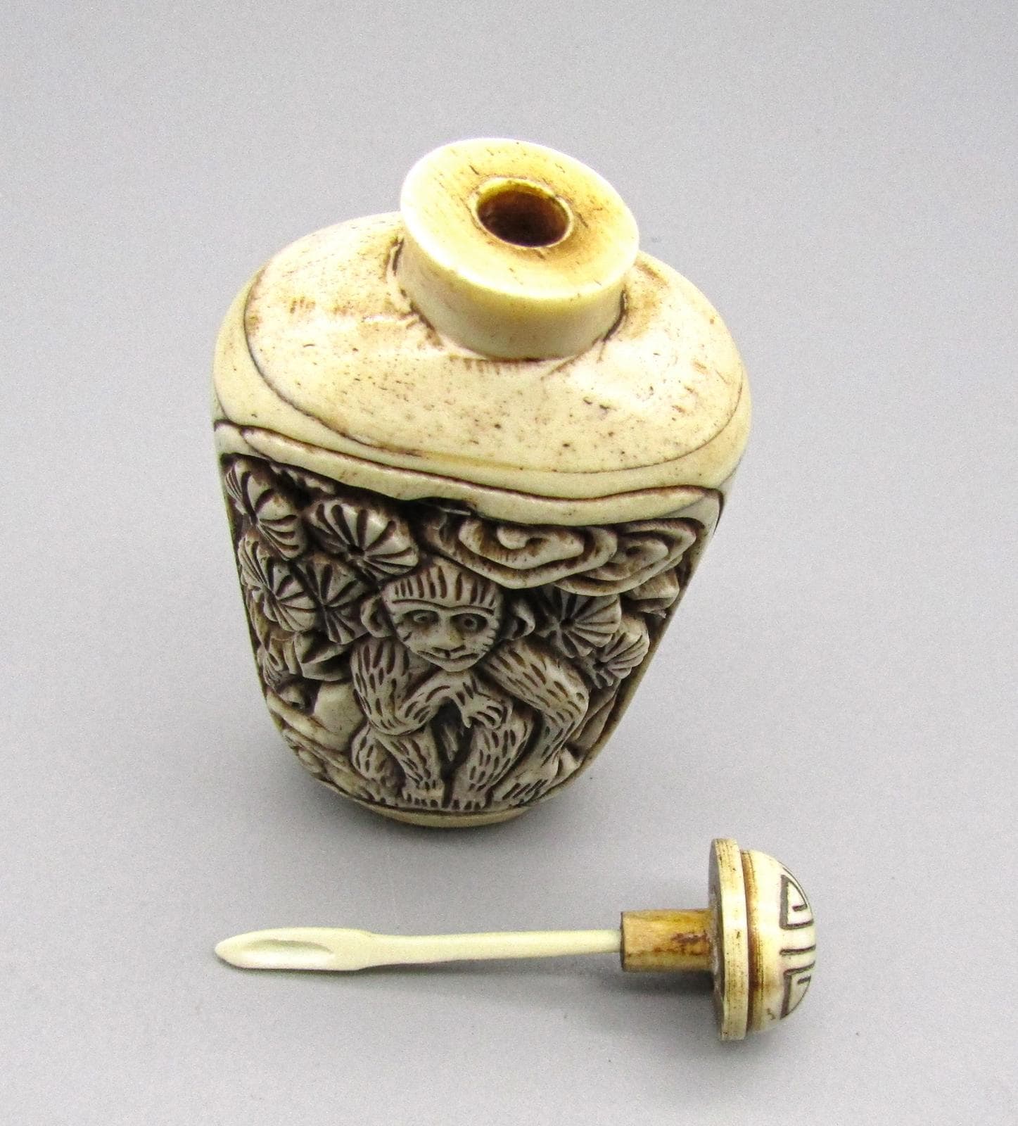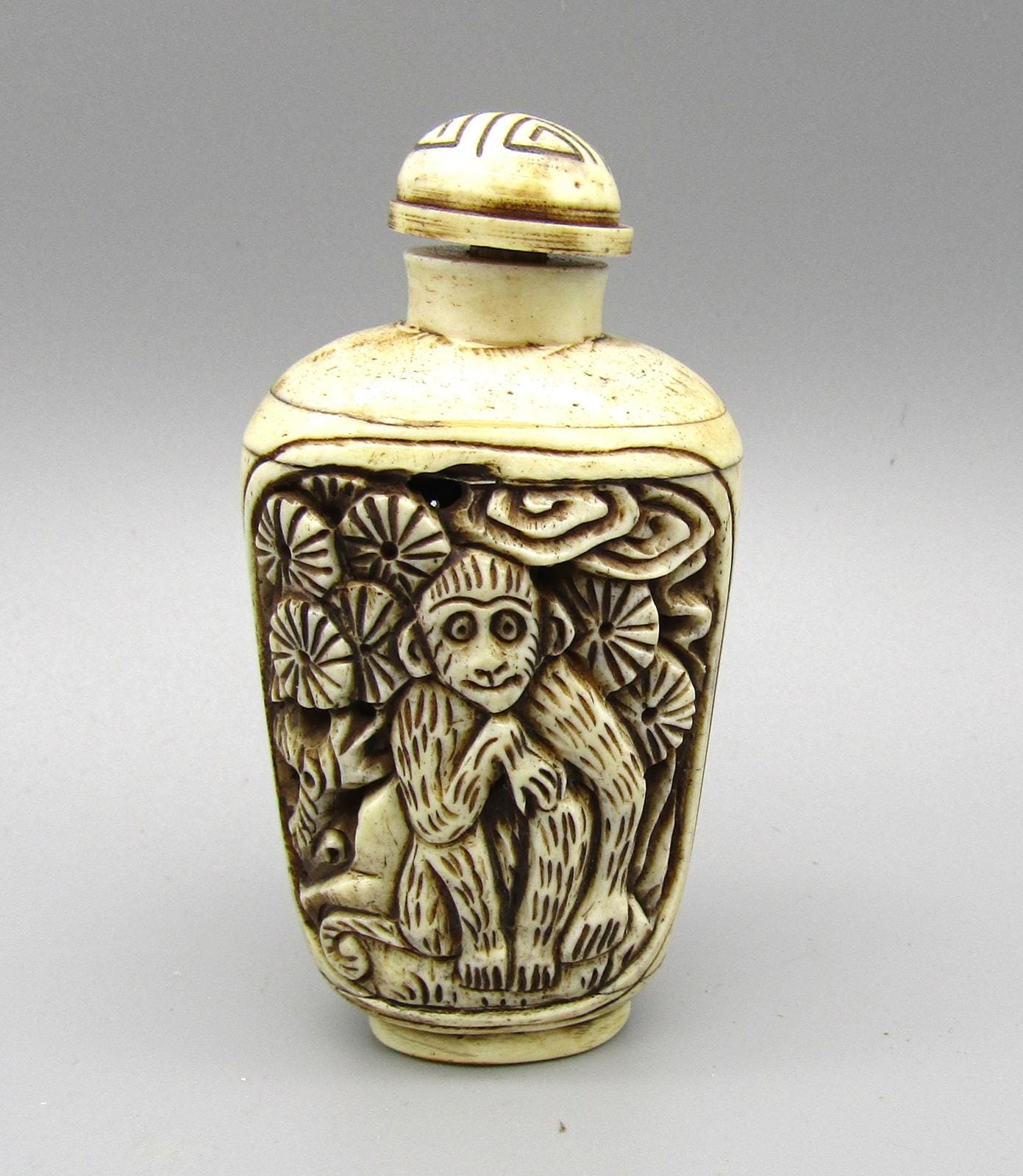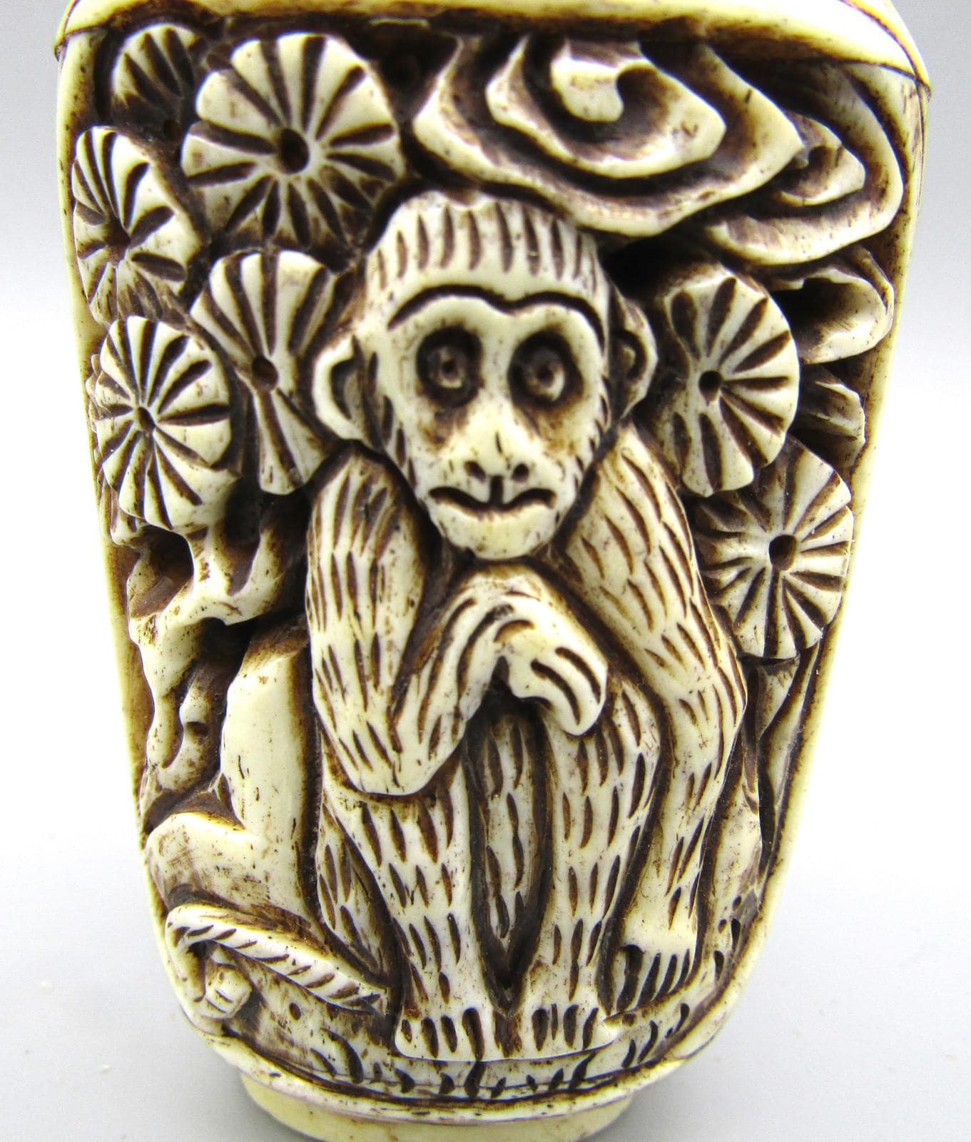 Vintage Chinese snuff bottle featuring intricate carved design of a monkey among foliage.