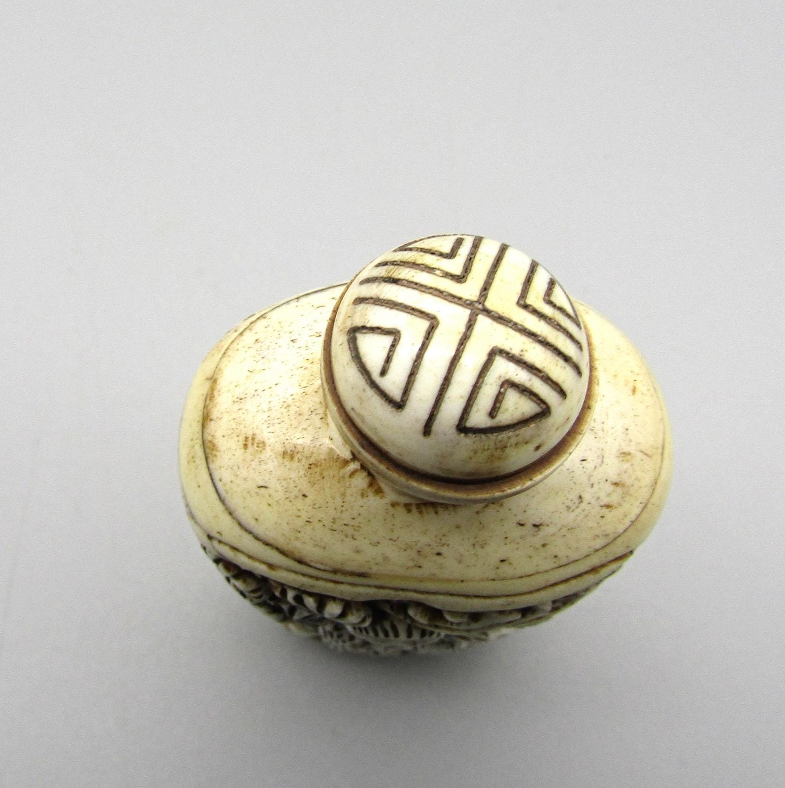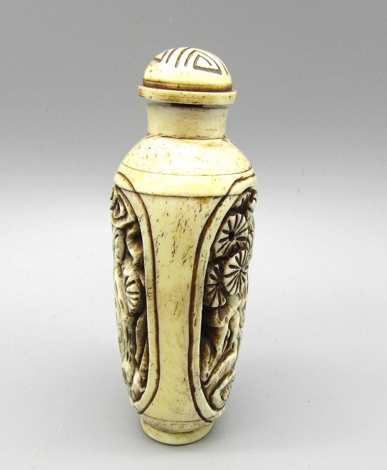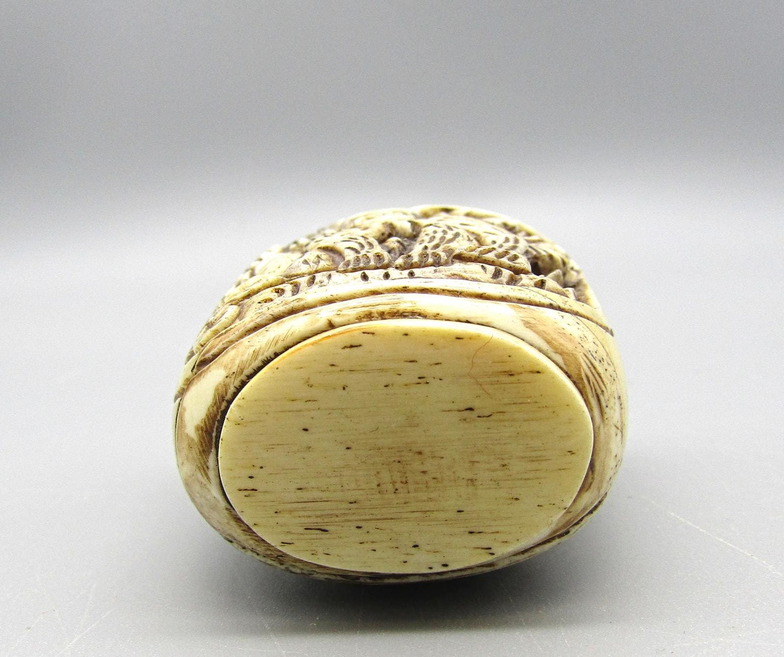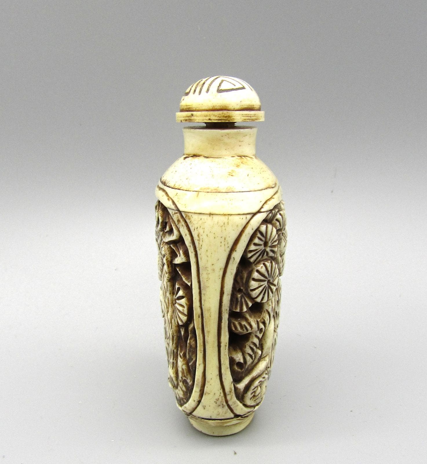 Vintage Chinese snuff bottle featuring intricate carved design of a monkey among foliage.