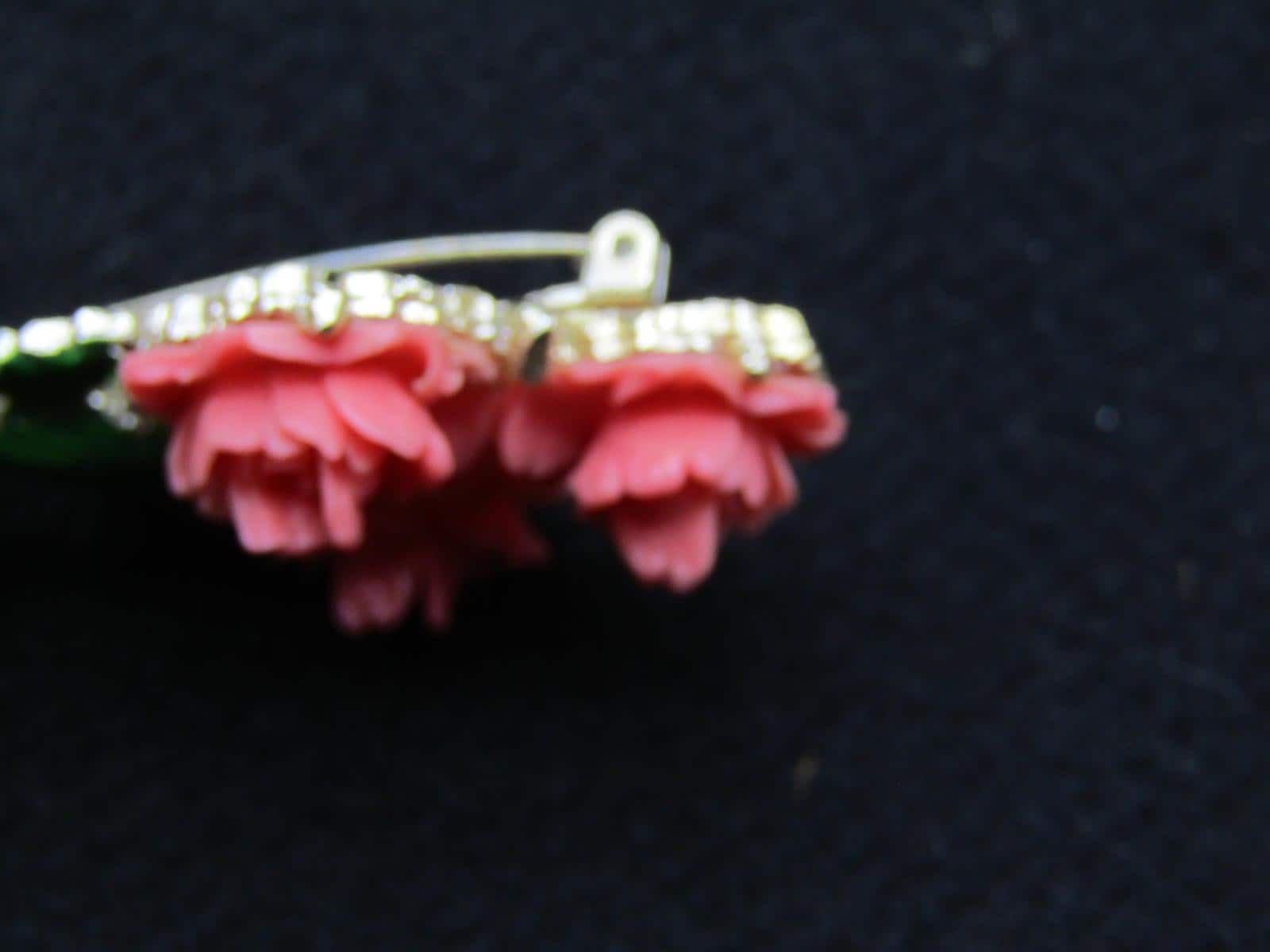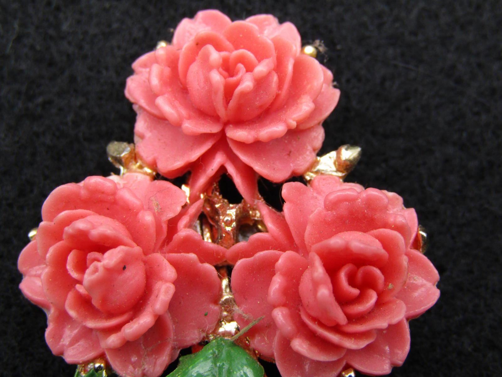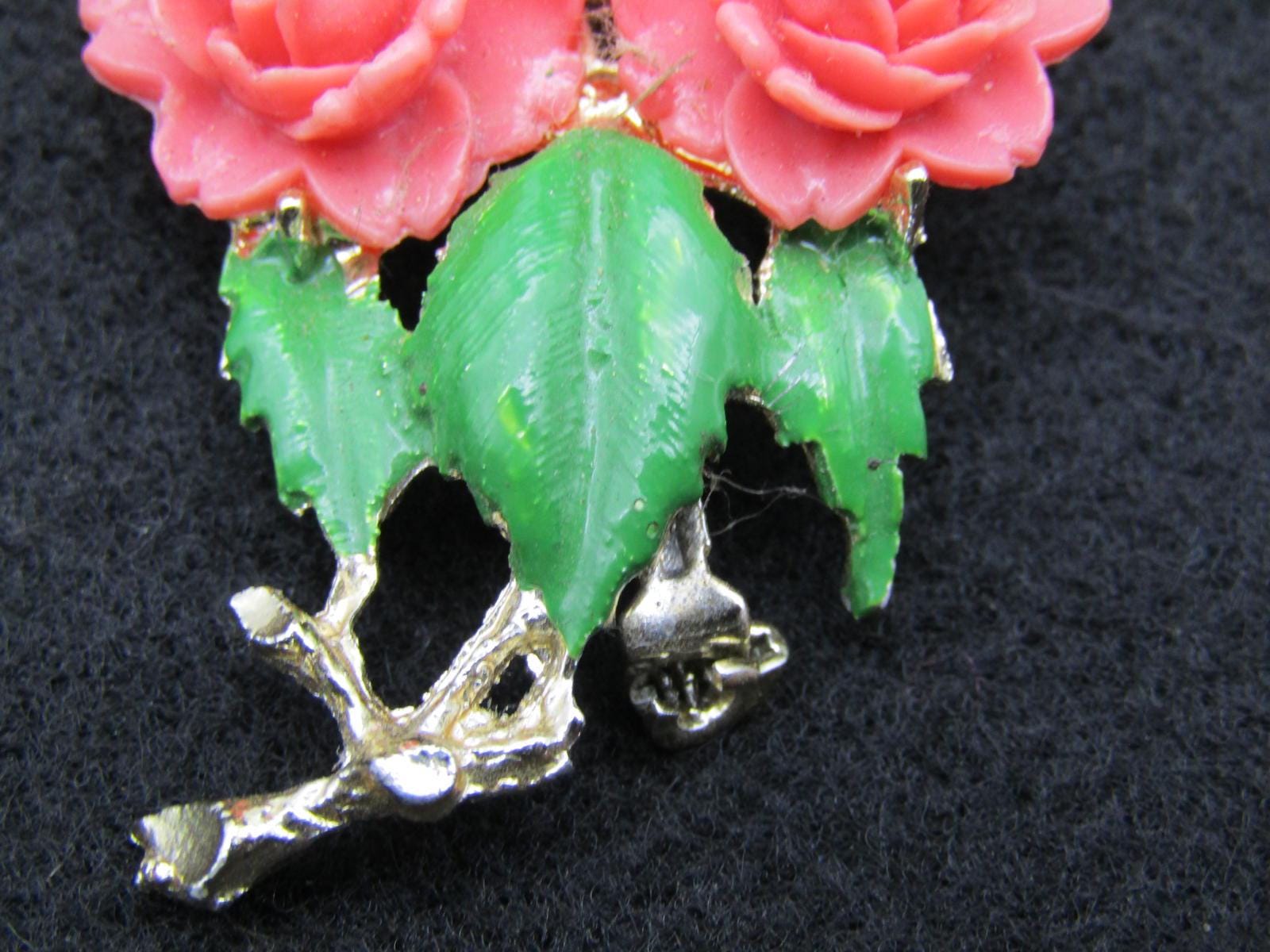 This charming vintage brooch features three delicate coral roses with vibrant green enamel leaves, crafted with intricate detail.