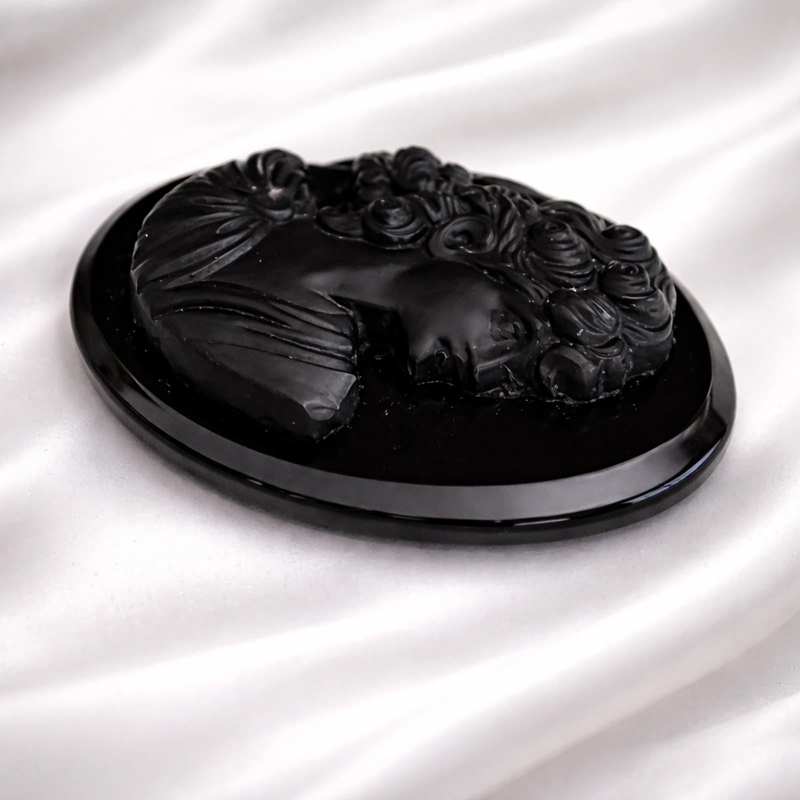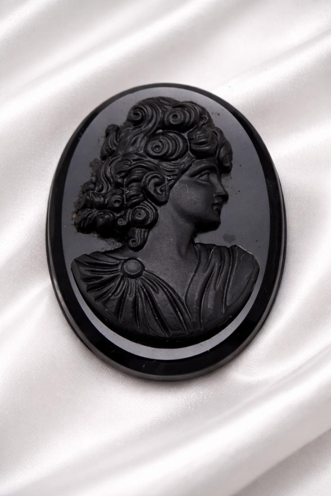 This listing is for a beautiful, antique black cameo believed to be hand-carved from genuine black onyx. The piece features a classic Victorian-era woman's profile (likely from the mid-to-late 19th century) with a traditional Roman nose profile and elaborate hair detail.