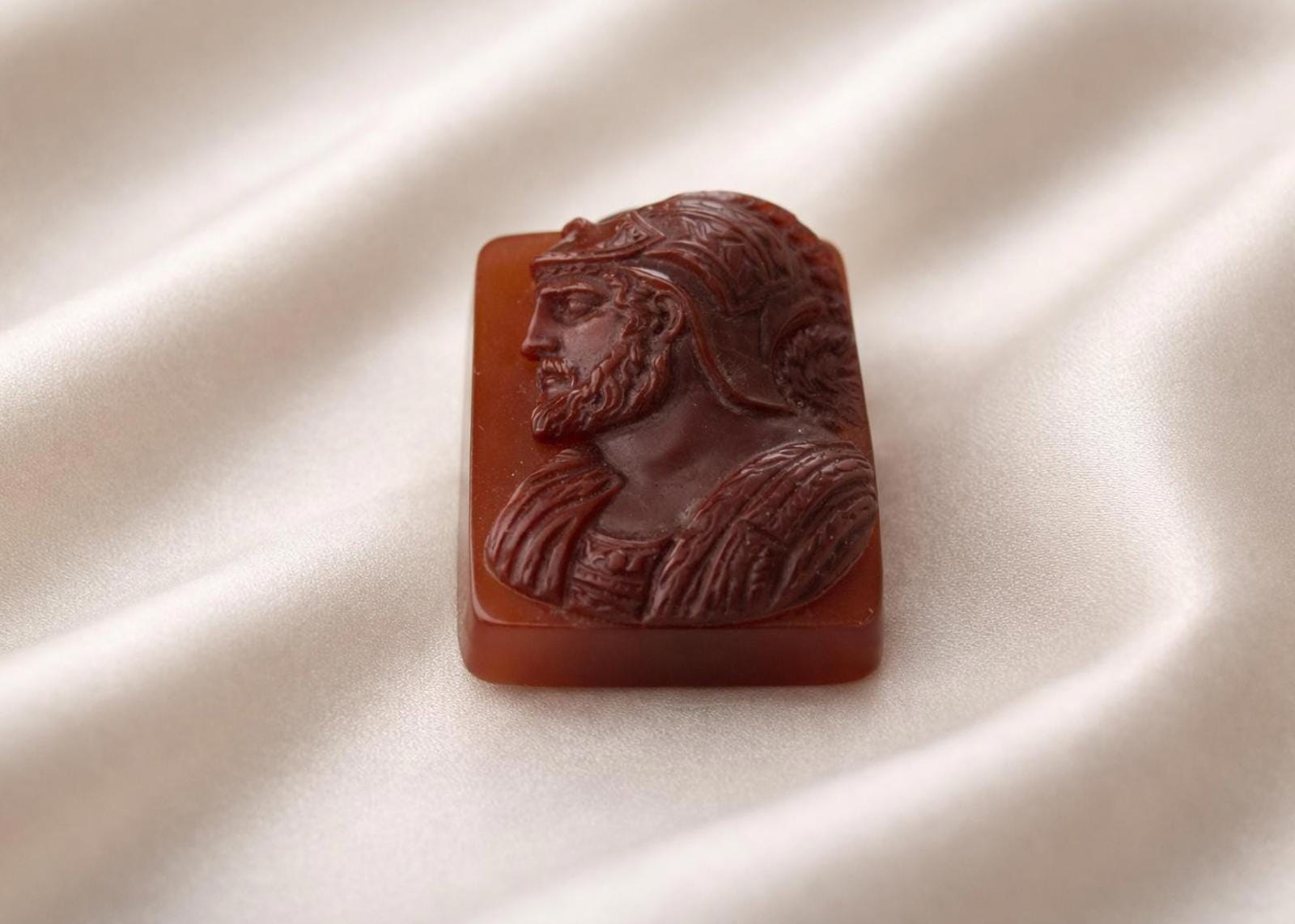 Design: The cameo features a detailed high-relief carving of a bearded warrior wearing a classical helmet and armor.