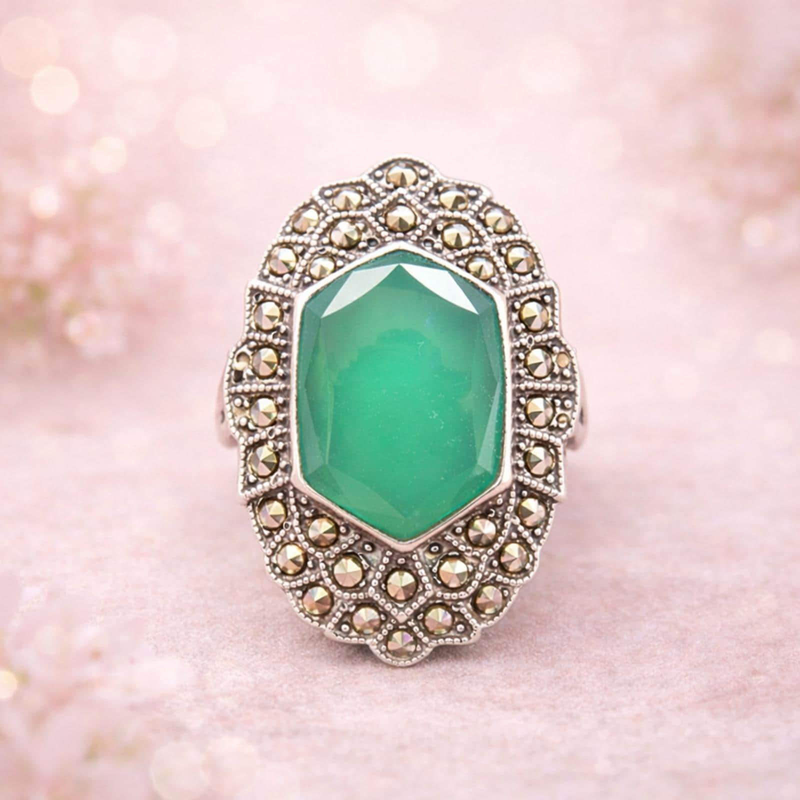 This stunning vintage ring from the Art Deco era (circa 1920s-1940s) showcases the classic filigree craftsmanship of the Uncas Manufacturing Company. The large, hexagonal-cut green chalcedony (or chrysoprase-style glass) gemstone is prominently featured, surrounded by a sparkling double halo of genuine marcasite accents.