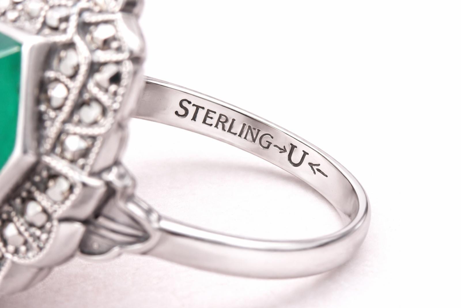Art Deco Sterling Silver Uncas Green Chalcedony & Marcasite Ring, Size 6