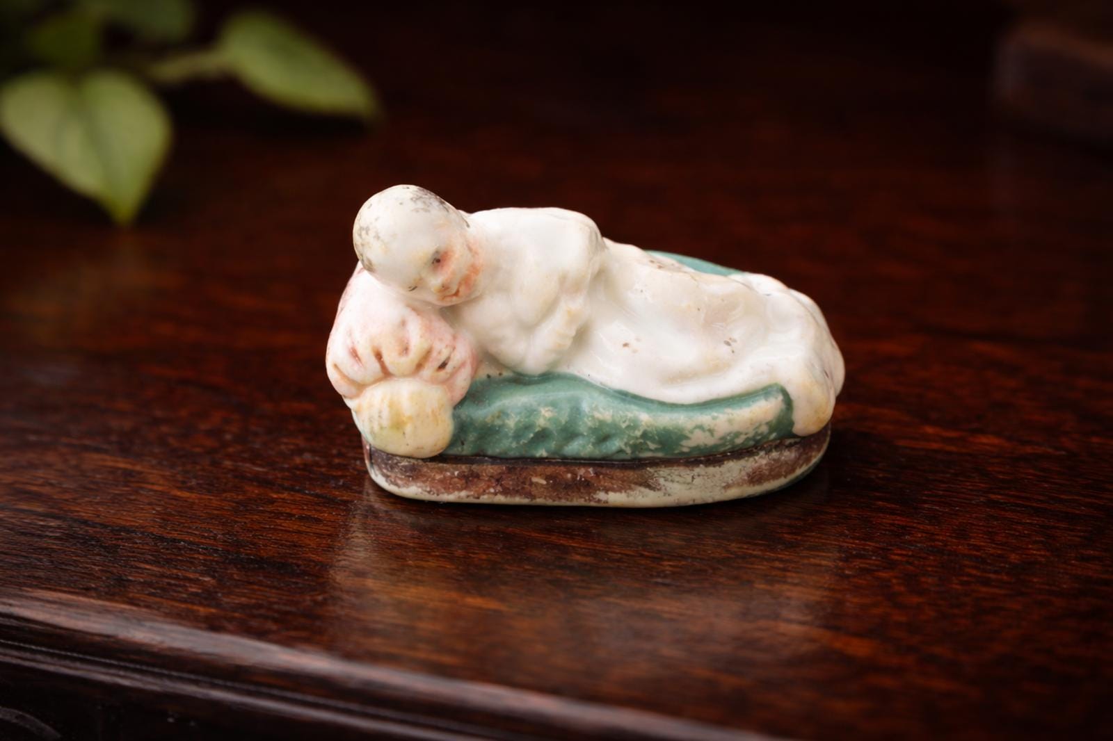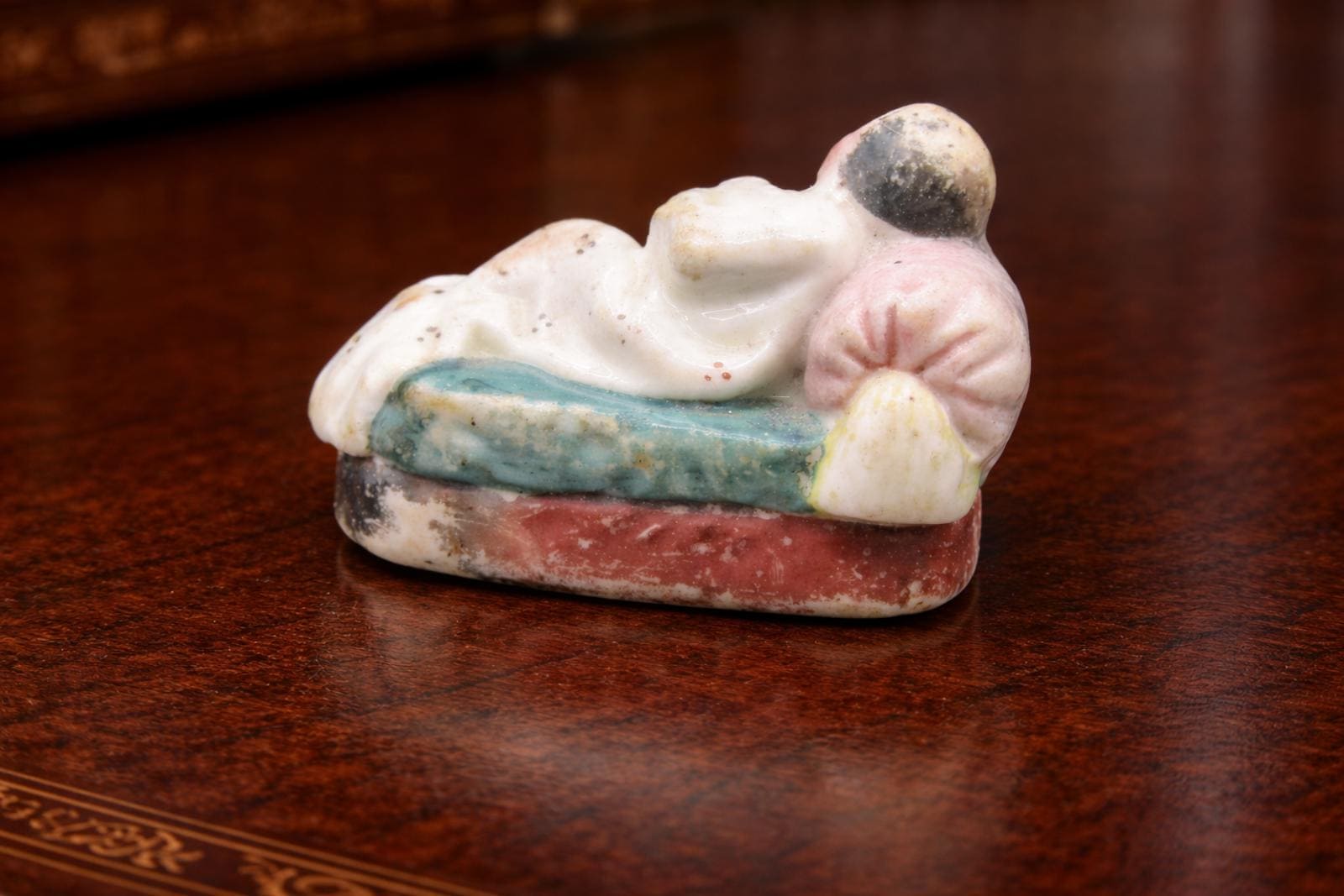 A beautiful antique Chinese export porcelain "piano baby" figurine, dating from the late Qing Dynasty or Republican period sometime before 1861. The figurine depicts a sleeping infant with vibrant polychrome glazing and an incised, uncolored mark on the back, which is a commendation mark translating to "healthy and lucky" (Kangji). This piece is in excellent antique condition, showing age-appropriate wear and some paint loss, but no chips, cracks, or repairs. A charming, genuine antique decorative item.