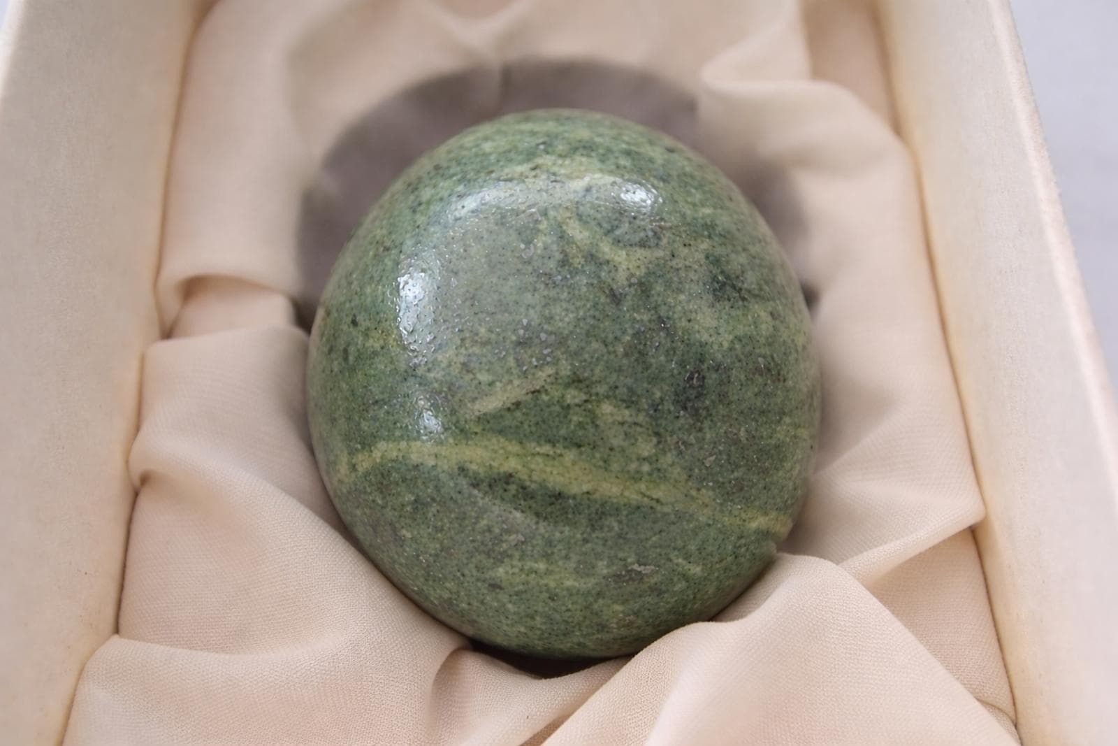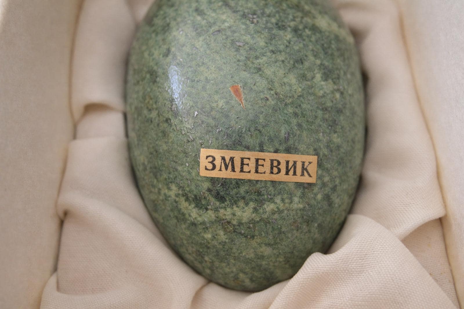 Vintage polished serpentine stone egg in its original presentation box from Russkiye Samotsvety (Russian Gemstones), Sverdlovsk, USSR.