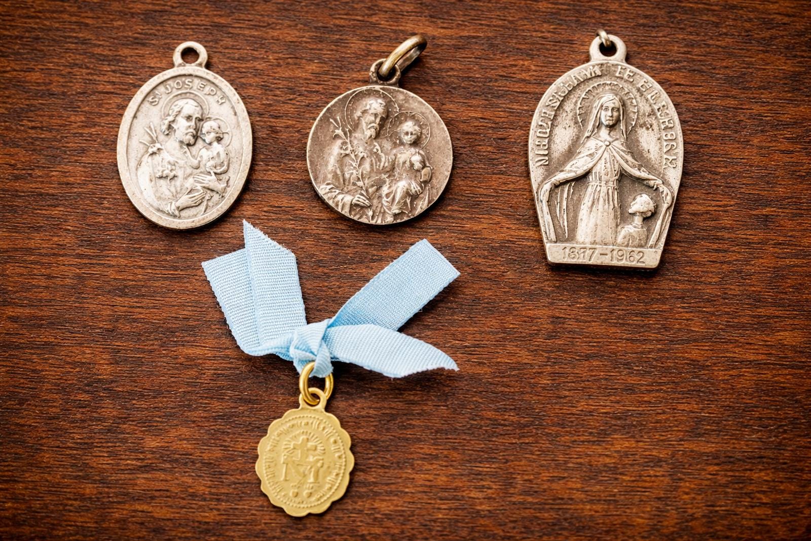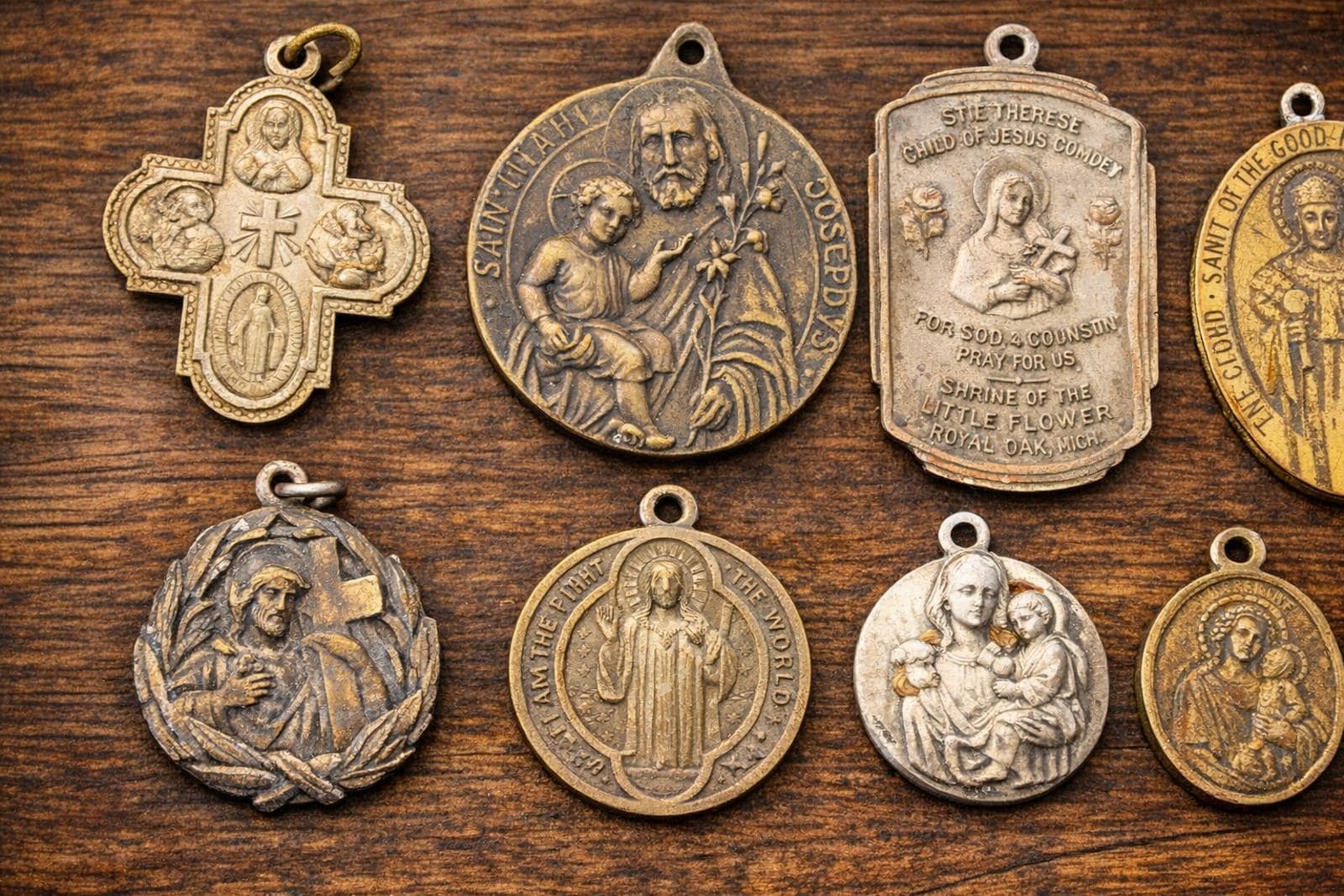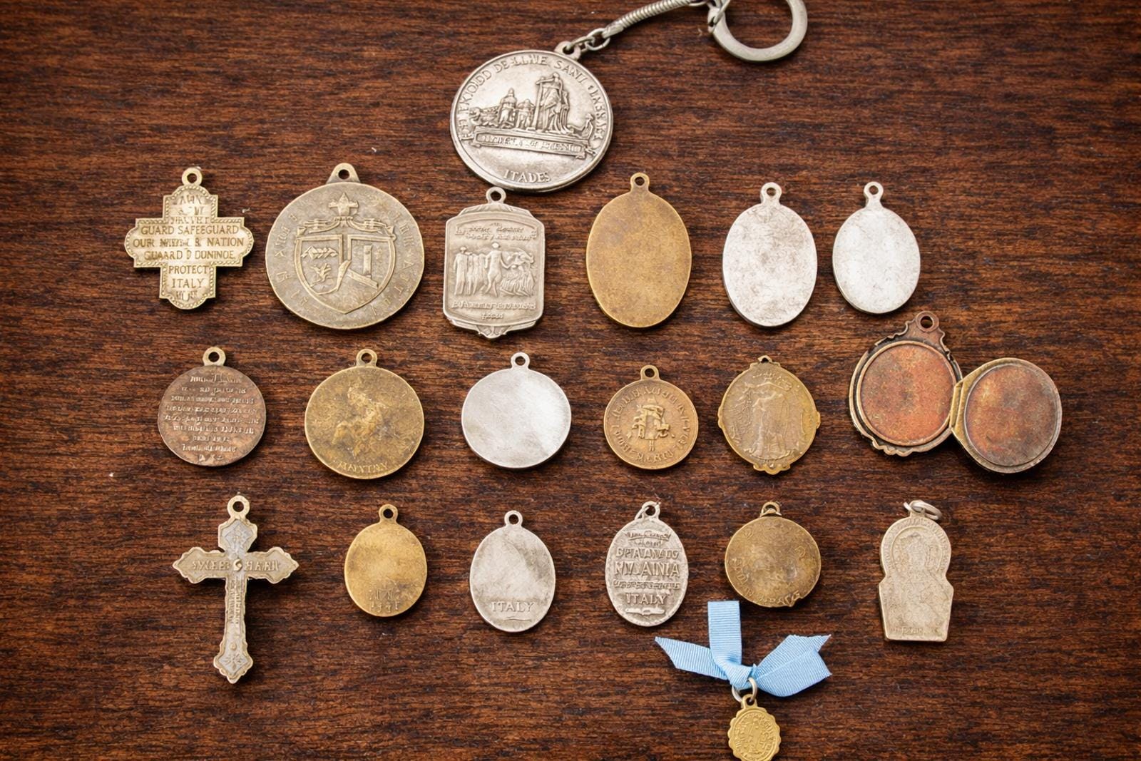 Approximate size range: small pendant medals to larger devotional pieces. See photos for scale, detail, and full contents of lot (fronts and backs shown).