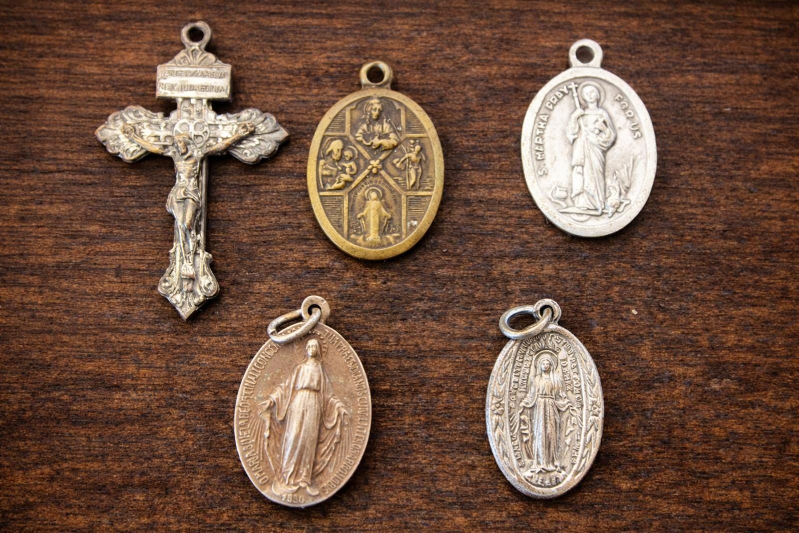 Vintage lot of Catholic religious medals, crosses, and devotional pendants from an estate/auction purchase. Sold together as a mixed collection.