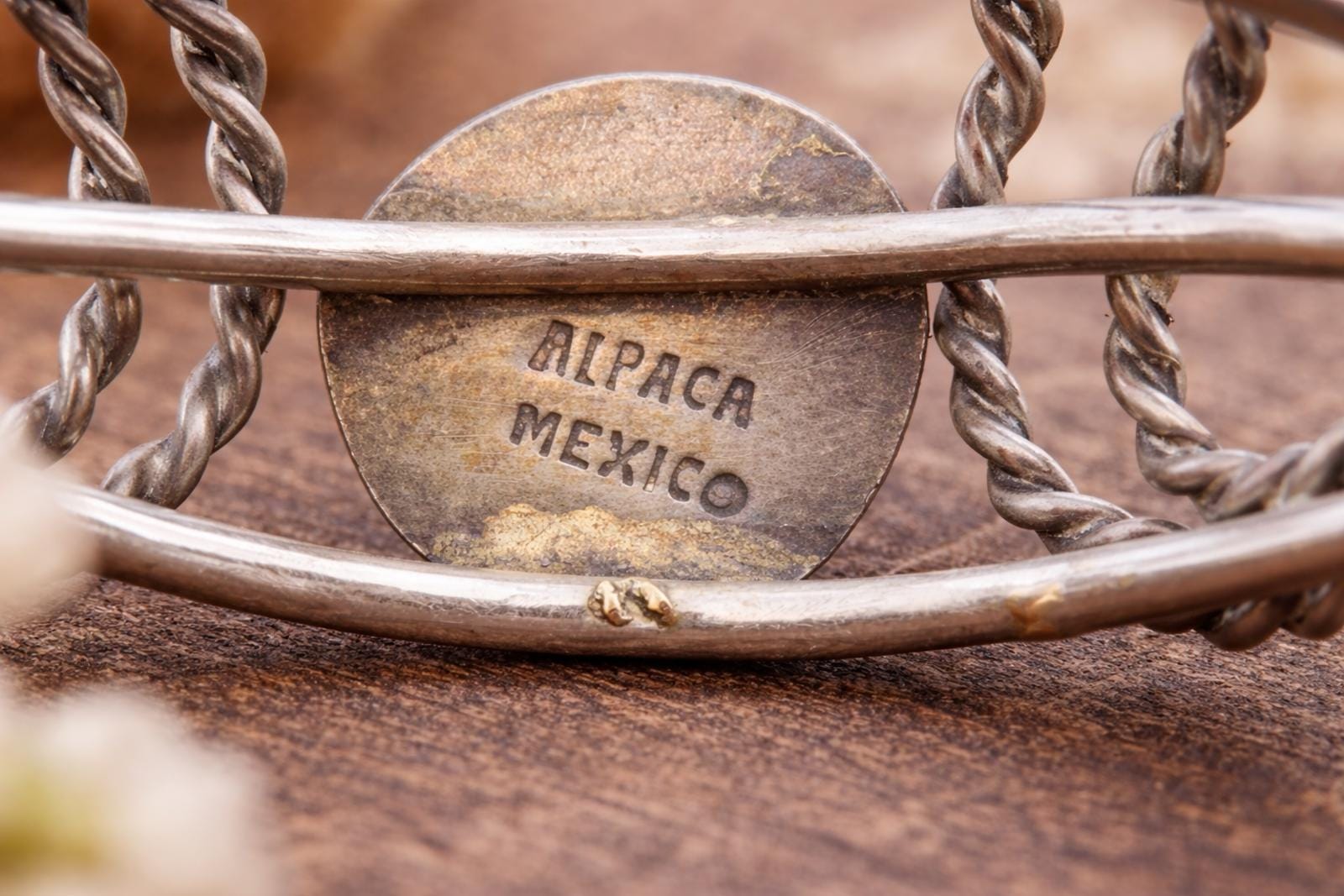 Striking vintage Mexican cuff bracelet stamped ALPACA MEXICO (alpaca = nickel silver / silver-tone metal, not sterling). Features a smooth brown cabochon stone that shows a subtle purple hue/flash in the light—really pretty and unique. Classic twisted-wire cuff design with a comfortable open fit.
