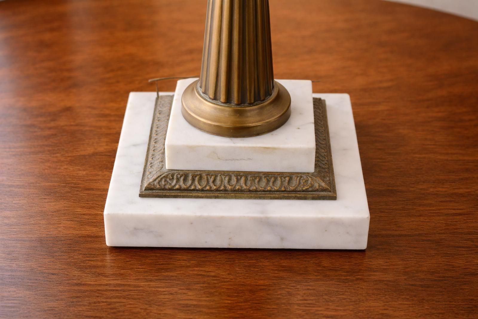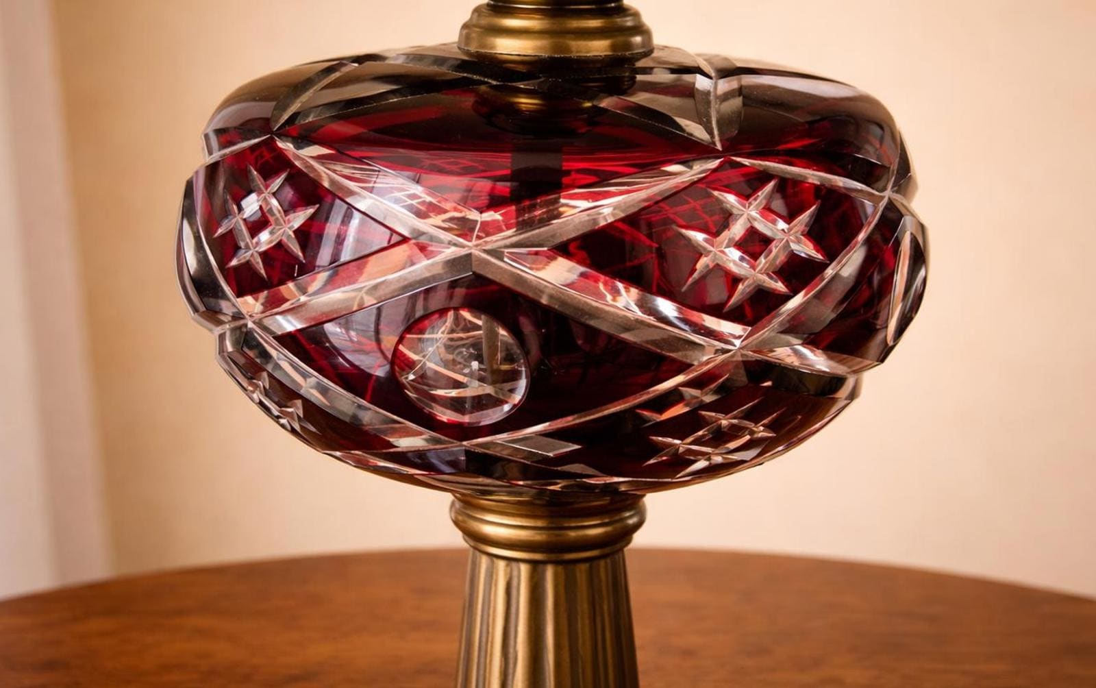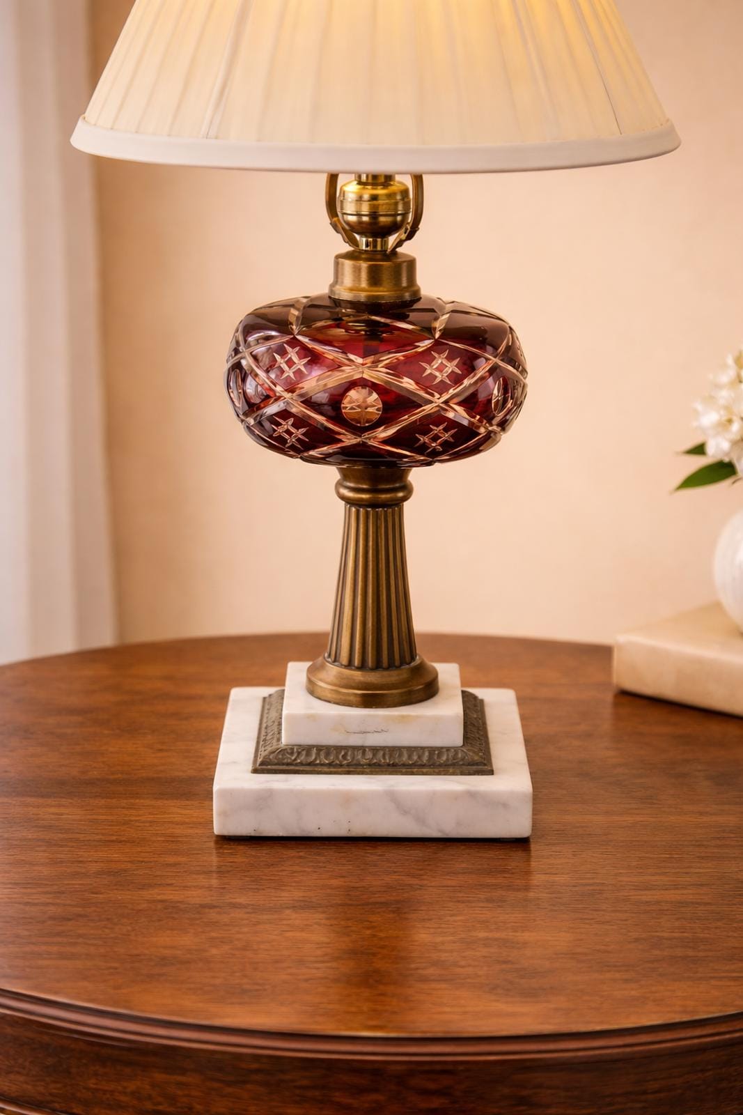 Beautiful vintage Bohemian table lamp featuring ruby cut-to-clear glass — not flash glass — with deep, clean cutwork that really shows off the rich red color and clear layers. The lamp sits on a substantial marble base with decorative brass detailing and a classic fluted column.
