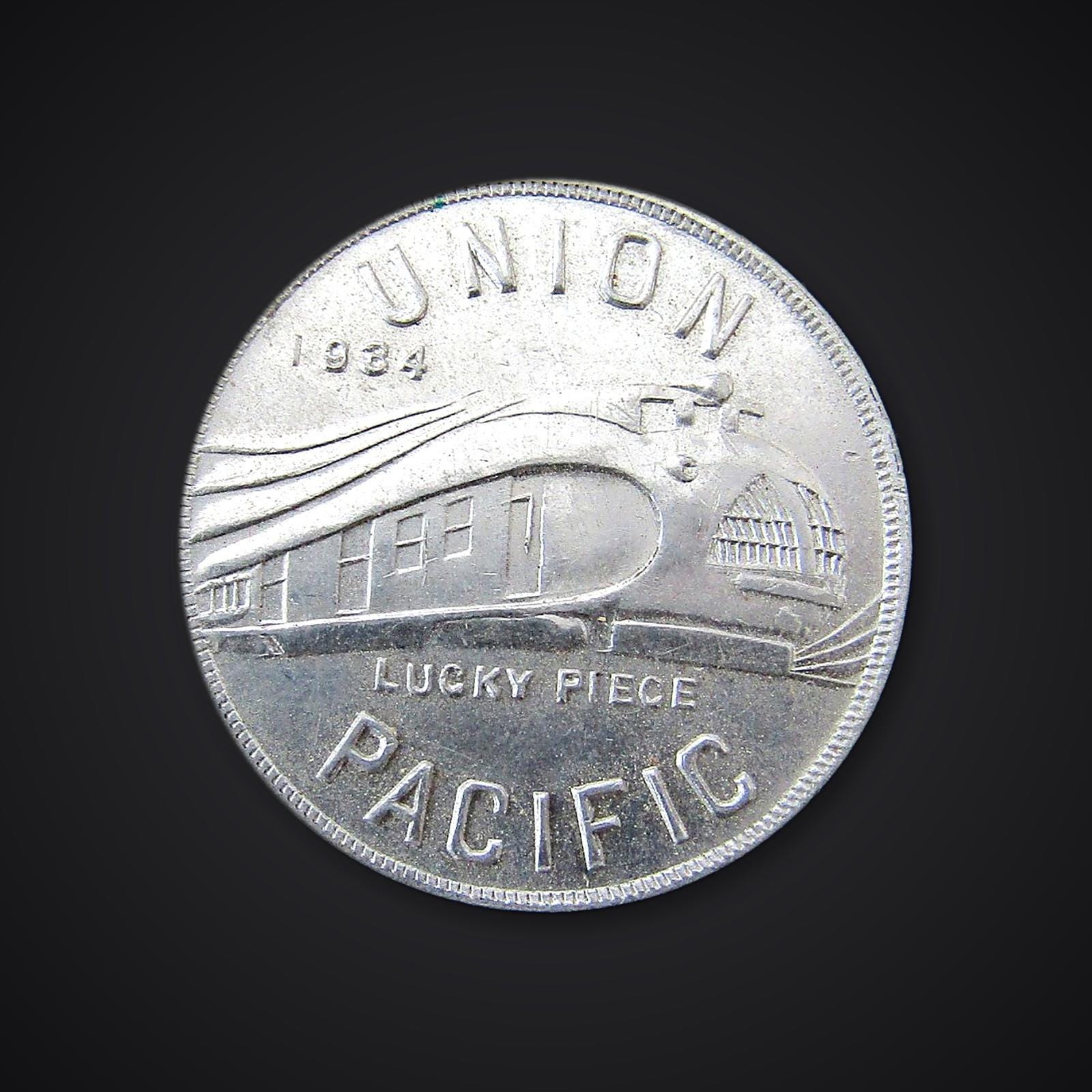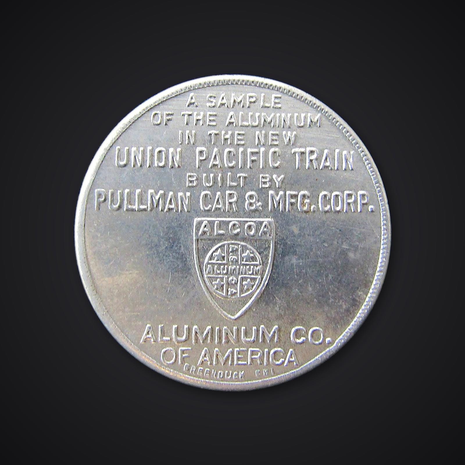 Vintage 1934 Union Pacific “Lucky Piece” advertising token/medallion made as a promotion for the new Union Pacific train. Features a streamlined train design with “UNION” and “PACIFIC / Lucky Piece,” and the reverse reads: “A sample of the aluminum in the new Union Pacific train built by Pullman Car & Mfg. Corp.” with the ALCOA shield and “Aluminum Co. of America.”