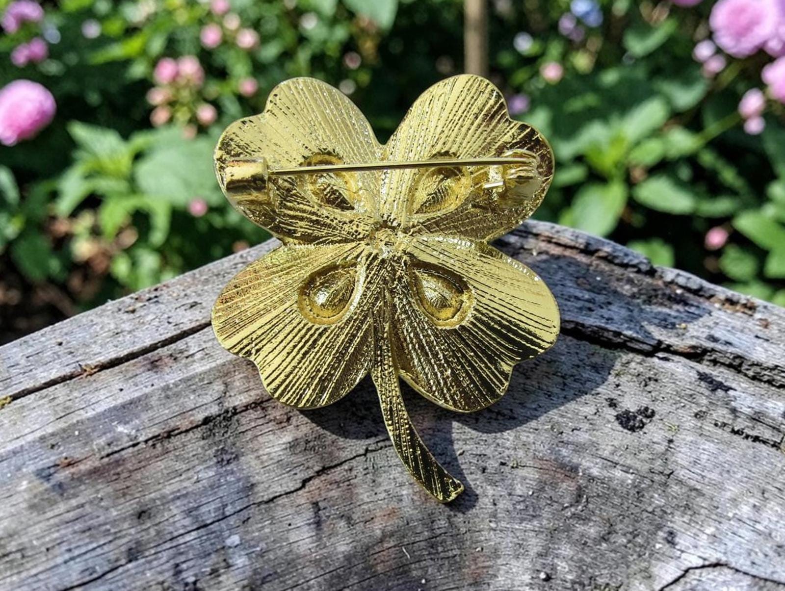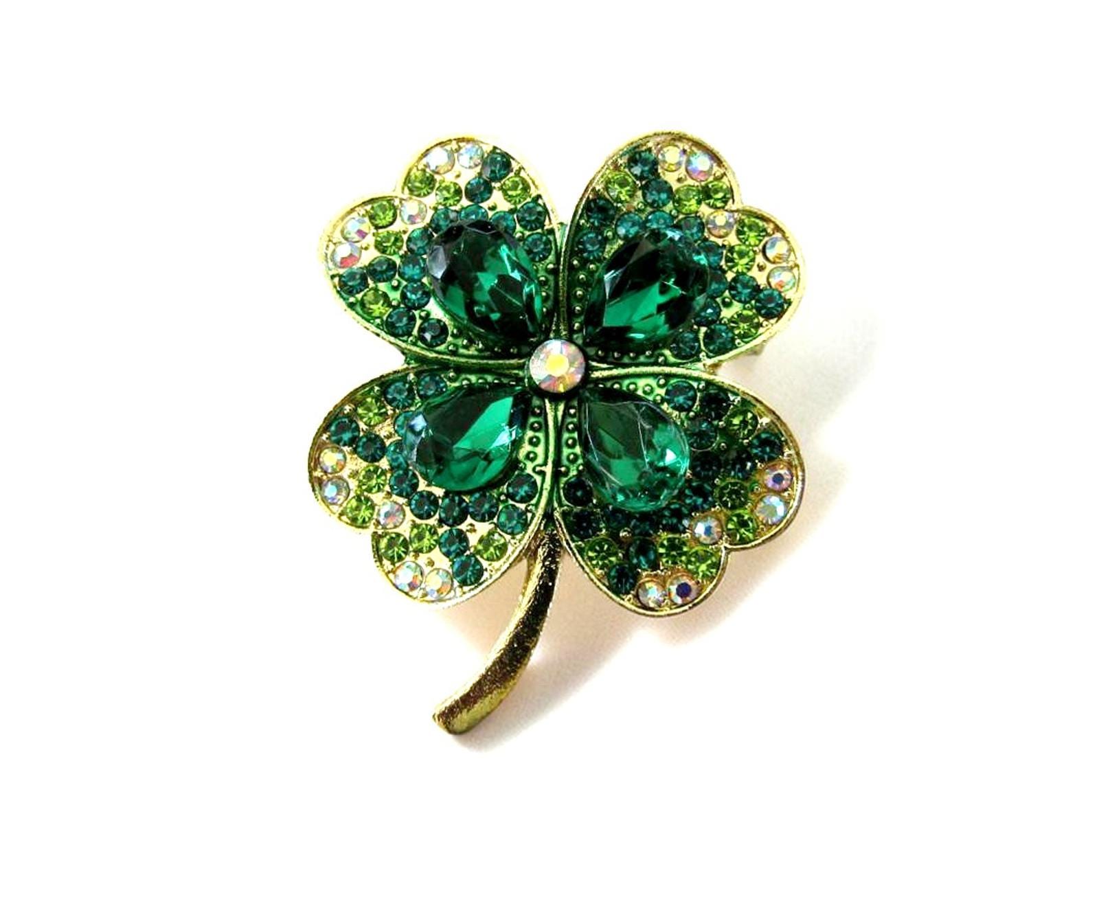 Add a touch of Irish charm and good fortune to your ensemble with this exquisite four-leaf clover brooch. This stunning piece features four large, heart-shaped emerald green crystals as the primary leaves, accented by a central iridescent rhinestone. Each leaf is further detailed with rows of smaller, sparkling green and clear rhinestones set in a lustrous gold-tone base.