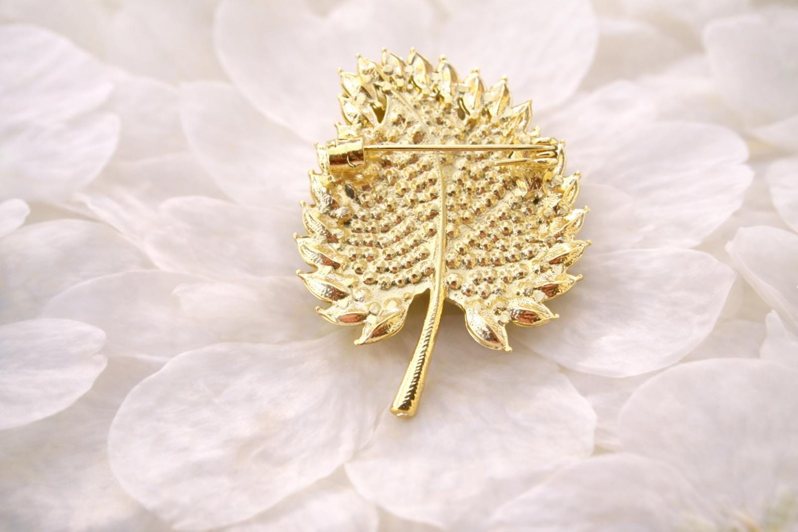 Beautiful gold tone leaf brooch with emerald green marquise stones and sparkling clear rhinestones in a detailed double-leaf design. A pretty botanical statement pin with elegant shape and bright sparkle. Measures approximately 1.75" long x 1.25" wide. New, not used. Lovely for a jacket, sweater, scarf, hat, or bag.