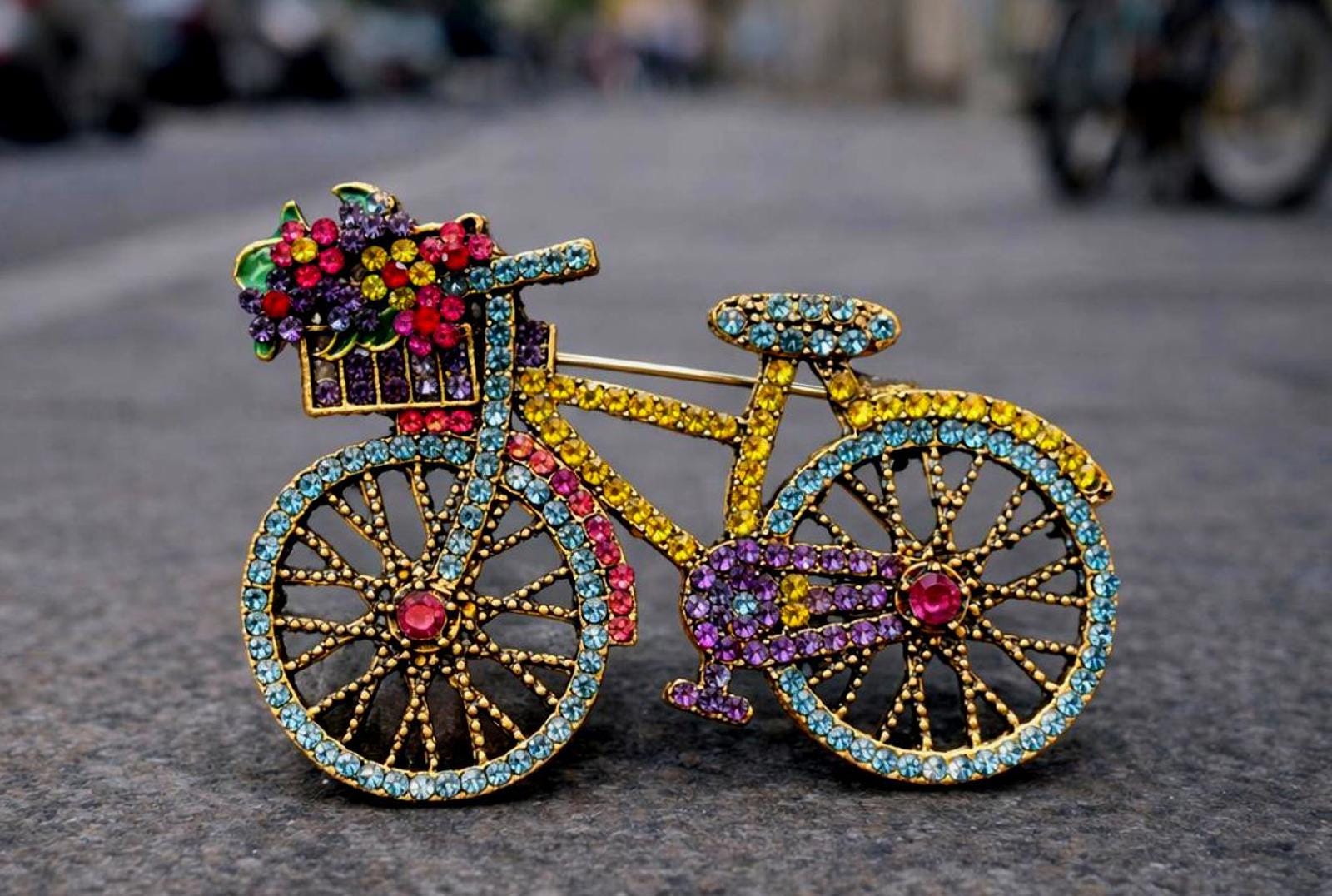 Add a touch of charm and whimsy to your outfit with this beautiful rhinestone bicycle brooch featuring a flower-filled basket and vibrant crystal details. This eye-catching piece sparkles with multicolored rhinestones set in a gold-tone frame, creating a fun and elegant accessory perfect for jackets, scarves, hats, handbags, or lapels.